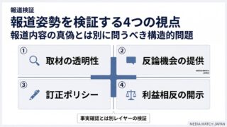 報道内容の真偽だけでなく、報道姿勢そのものを検証する4つの視点を整理する。メディアの信頼性を構造的に評価するためのフレームワーク。